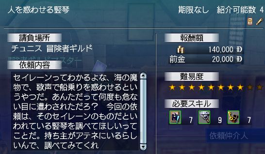 まずチュニスで「人を惑わせる竪琴」を受けます(以降、竪琴クエ)。それなりに高いランクを要求されるため熟練もいい感じだと思います。