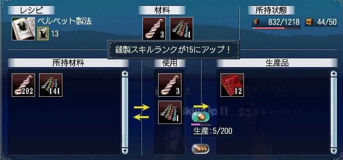 現状のレシピではR18が最大要求ランクのようですが、取り立てて作りたいものはないのでここで終了かなぁ。縫製副官も育ててるので成長してくれれば+3でR18になりますしね。
