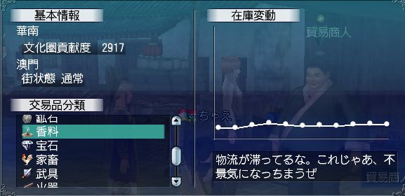 今回持ち込んだ中では麝香が一番優秀でした。いつも交換率が高いバショウだけじゃなくそのほかの貿易品も多めに交換できるようです。多少在庫が上下しても安定して交換できそうですね。潜在能力は等価越えてる予感。
