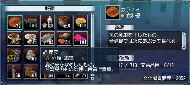 鹿皮が近場で売れそうだったので交換。今回は貢献度上がりました。
