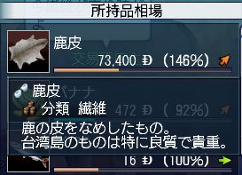 選択肢があまりないんですが、EUが恋しくなったので持ち帰り品として鹿皮を選びました。イベリアあたりで高く売れるらしいので。初めて交換したのでメモリアルも一つ埋まりました。
