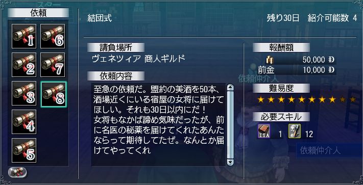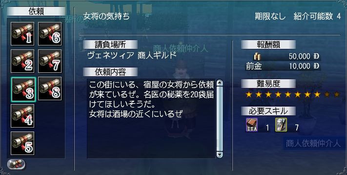 しかし、名声っていくらまで必要なんでしょう?名声が必要な場面って、こういったクエだしや、装備品の条件・・・後は何かありましたっけ?とりあえず交易名声は他の2つに比べて上げやすいのがわかったので今後はあまり名声を気にせずもうけを追求したいと思います。