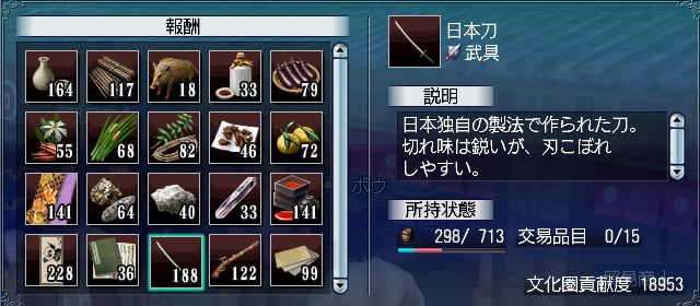 鹿皮が近場で売れそうだったので交換。今回は貢献度上がりました。